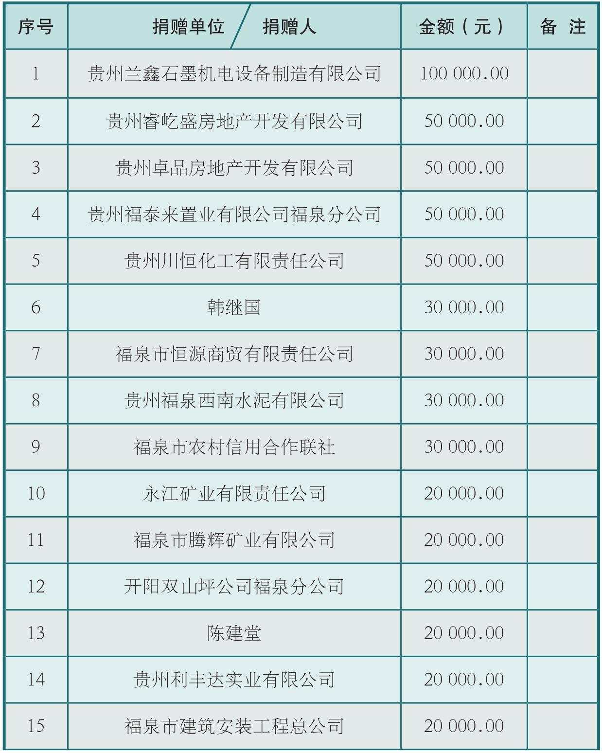 (注: 序号捐赠单位 捐赠人金额(元)备注1贵州兰鑫石墨机电设备制造有限公司100000.002贵州睿屹盛房地产开发有限公司50 000.00 3贵州卓品房地产开发有限公司50 000.00 4贵州福泰来置业有限公司福泉分公司50 000.00 5贵州川恒化工有限责任公司50 000.00 6韩继国30 000.00 7福泉市恒源商贸有限责任公司30 000.00 8贵州福泉西南水泥有限公司30 000.00 9福泉市农村信用合作联社30 000.00 10永江矿业有限责任公司20 000.00 11福泉市腾辉矿业有限公司20 000.00 12开阳双山坪公司福泉分公司20 000.00 13陈建堂20 000.00 14贵州利丰达实业有限公司20 000.00 15福泉市建筑安装工程总公司20 000.00)