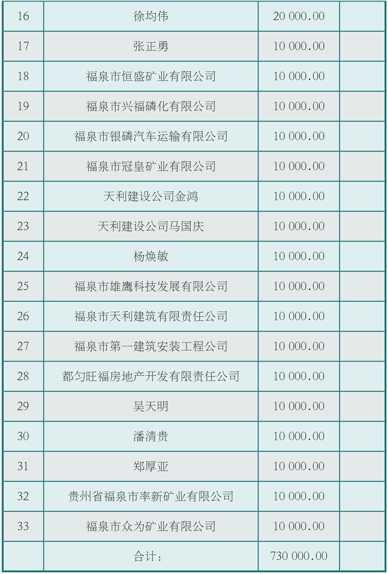 (注: 16徐均伟20 000.00 17张正勇10 000.00 18福泉市恒盛矿业有限公司10 000.00 19福泉市兴福磷化有限公司10 000.00 20福泉市银磷汽车运输有限公司10 000.00 21福泉市冠皇矿业有限公司10 000.00 22天利建设公司金鸿10 000.00 23天利建设公司马国庆10 000.00 24杨焕敏10 000.00 25福泉市雄鹰科技发展有限公司10 000.00 26福泉市天利建筑有限责任公司10 000.00 27福泉市第一建筑安装工程公司10 000.00 28都匀旺福房地产开发有限责任公司10 000.00 29吴天明10 000.00 30潘清贵10 000.00 31郑厚亚10 000.00 32贵州省福泉市率新矿业有限公司10 000.00 33福泉市众为矿业有限公司10 000.00合计:730 000.00)