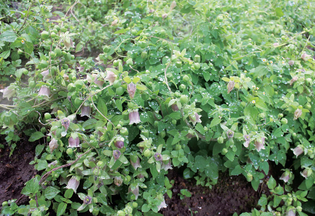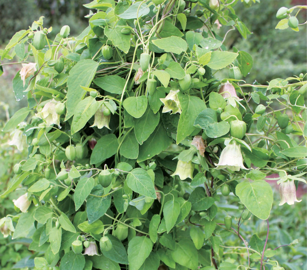 【识别特征】多年生宿根缠绕植物,茎基具多数瘤状茎痕,根常肥大成圆柱形,肉质,上端5~10cm部分有细密环纹,而下部则疏生横长皮孔。茎缠绕,有多数分枝。叶在主茎及侧枝上的互生,在小枝上的近于对生,叶柄长0.5~2.5cm,有疏短刺毛,叶片卵形或狭卵形,长1~6.5cm,宽0.8~5.0cm,基部近于心形,边缘具波状钝锯齿,分枝上叶片渐趋狭窄,叶基圆形或楔形,两面疏或密地被贴伏的长硬毛或柔毛。花单生长在枝端,与叶柄互生或近于对生。花萼贴生至子房中部,筒部半球状,裂片宽披针形或狭矩圆形,长1~2cm,宽6~8mm。花冠阔钟状,长1.8~2.3cm,直径1.8~2.5cm,黄绿色,内面有明显紫色斑。柱头有白色刺毛。蒴果下部半球状,上部短圆锥状。种子多数,卵形,细小。花、果期7~10月。