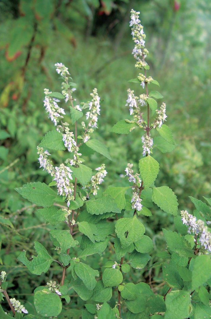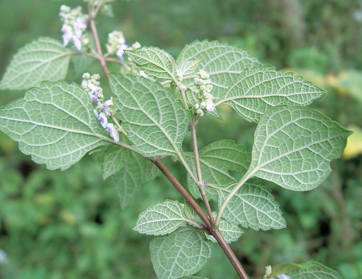 【识别特征】小灌木,高可达1.2m。茎四稜形,上部多分枝,密被小疏柔毛,幼枝极密被茸毛,带紫红色。茎叶对生,卵圆形或菱状卵圆形,长2~6cm,宽1.3~3.0cm,先端锐尖或渐尖,基部楔形,骤然渐狭下延成假翅,边缘具粗圆齿状锯齿,上面疏被小疏柔毛及腺点,有时近无毛,下面密被灰白色短茸毛,侧脉3~4对,两面十分明显,脉纹常带紫红色。聚伞花序具3~5朵花,最下部者有时多至7朵花,具长2~5mm的总梗,在茎及分枝顶上排列成长6~15cm狭圆锥花序。花萼钟形,明显带紫红色。花冠唇形,长约7mm,有时达12mm。雄蕊4枚,略伸出。花柱丝状,伸出,先端相等2浅裂。小坚果倒卵状三棱形,长1.3mm。花期7~10月,果期8~11月。