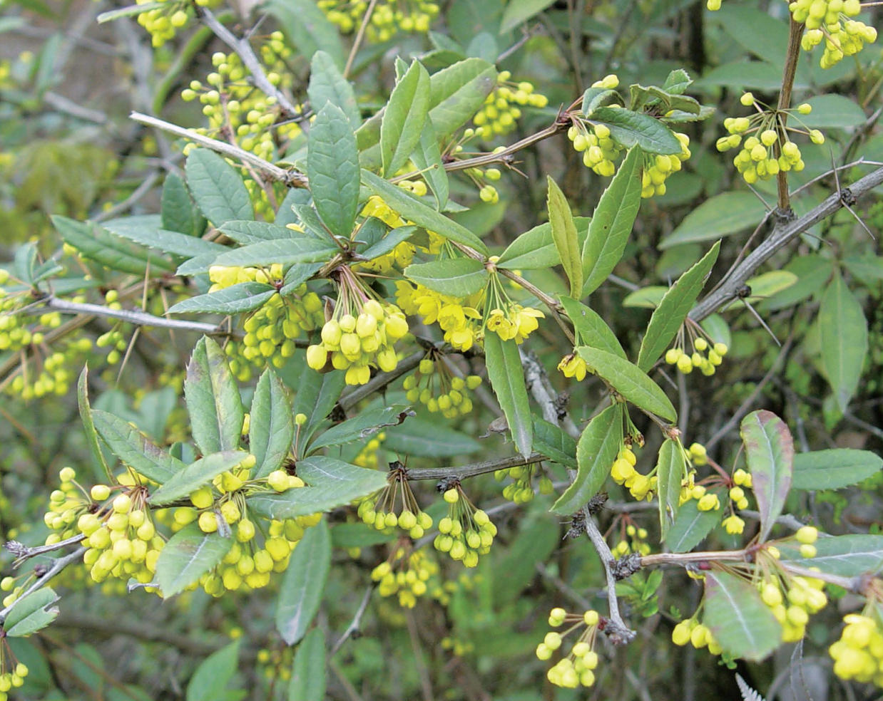 【识别特征】常绿灌木,高1~2m。茎刺粗壮,三分叉,长1.0~2.5cm。叶革质,坚硬,长圆形、长圆状椭圆形或长圆状倒卵形,长3.5~10.0cm,宽1.0~2.5cm,先端急尖,具1根硬刺尖,基部楔形,叶缘平展,每边具5~18枚刺齿。叶柄长仅1~2mm。花7~20朵簇生。花梗长5~11mm。花黄色,萼片3轮,外萼片卵形,中萼片近圆形,内萼片倒卵状长圆形。花瓣倒卵形,长约5mm,宽3.8~4.0mm,先端缺裂。雄蕊长约3mm。浆果倒卵状长圆形,长7~8mm,直径约5mm,熟时红色,顶端具明显宿存花柱,被白粉。种子2~3粒。花期3~4月,果期6~9月。