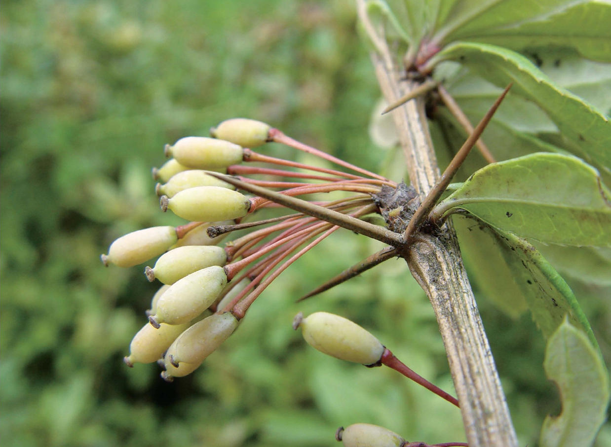 【附注】贵州小檗属Berberis植物种类较多,外形相似,难以准确鉴定。在贵州,该属多种植物的根作为药材“三颗针”收购和使用,尤其以豪猪刺Berberis julianae Schneid.的用量最大,其与假豪猪刺的植物形态比较相似,主要区别在于豪猪刺的胚珠单生,而假豪猪刺的胚珠为2~3枚。附图为豪猪刺Berberis julianae Schneid.