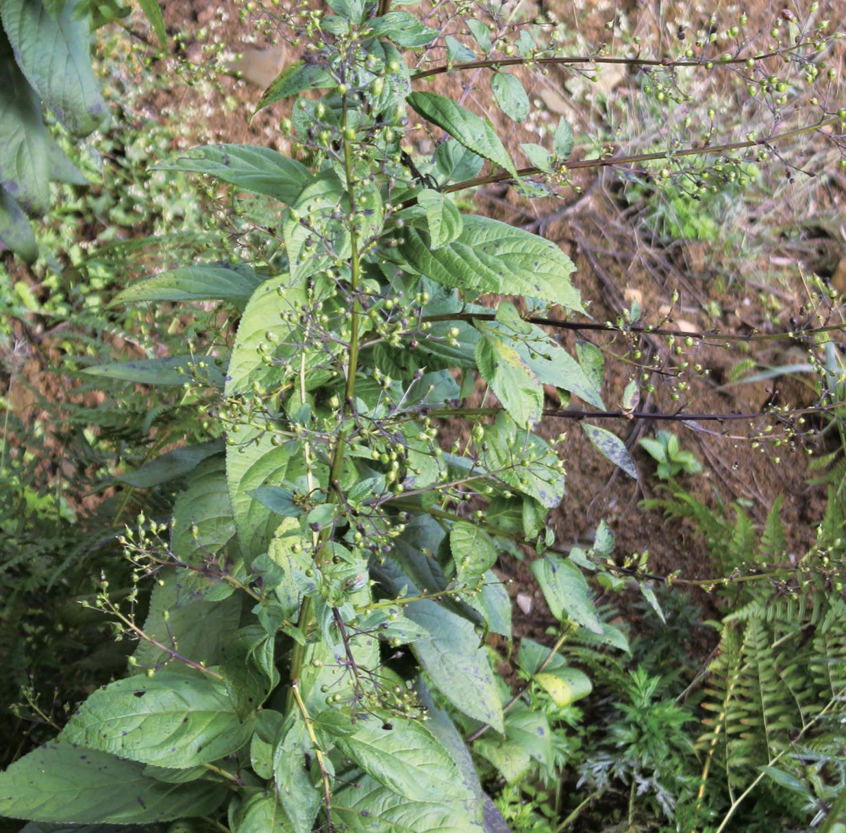 【识别特征】高大草本,可达1m。支根数条,纺锤形或胡萝卜状膨大,粗可达3cm以上。茎四棱形,有浅槽,常分枝。叶在茎下部多对生而具柄,上部的叶有时互生而柄极短,柄长者达4.5cm,叶片多变化,多为卵形,有时上部的为卵状披针形至披针形,基部楔形、圆形或近心形,边缘具细锯齿,大者长达30cm,宽达19cm,上部最狭者长约8cm,宽仅1cm。花序为疏散的大圆锥花序,由顶生和腋生的聚伞状圆锥花序合成,长可达50cm,但在较小的植株中,仅有顶生聚伞圆锥花序,长不及10cm,聚伞花序常2~4回复出,花梗有腺毛。花褐紫色。花冠唇形,长8~9mm,花冠筒多少呈球形,上唇比下唇约长2.5mm。雄蕊稍短于下唇,花丝肥厚。蒴果卵圆形,连同短喙长8~9mm。花期6~10月,果期9~11月。