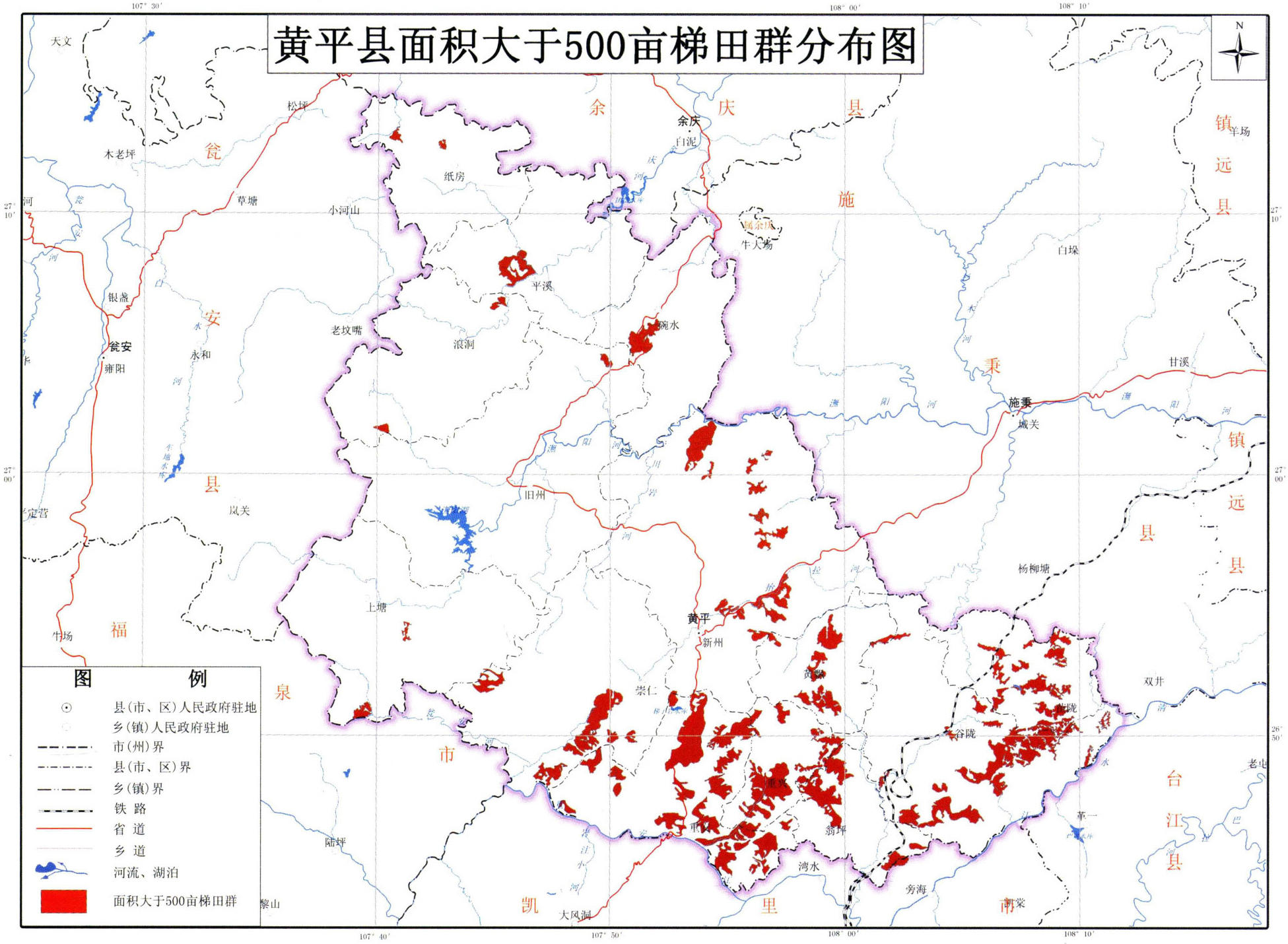 (注: 黄平县面积大于500亩的古梯田群分布图)