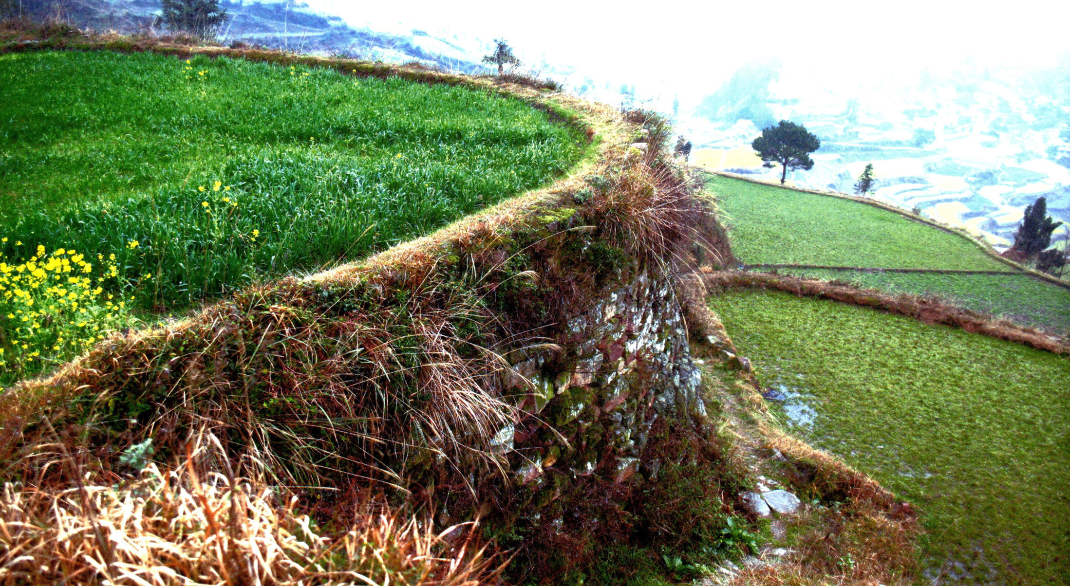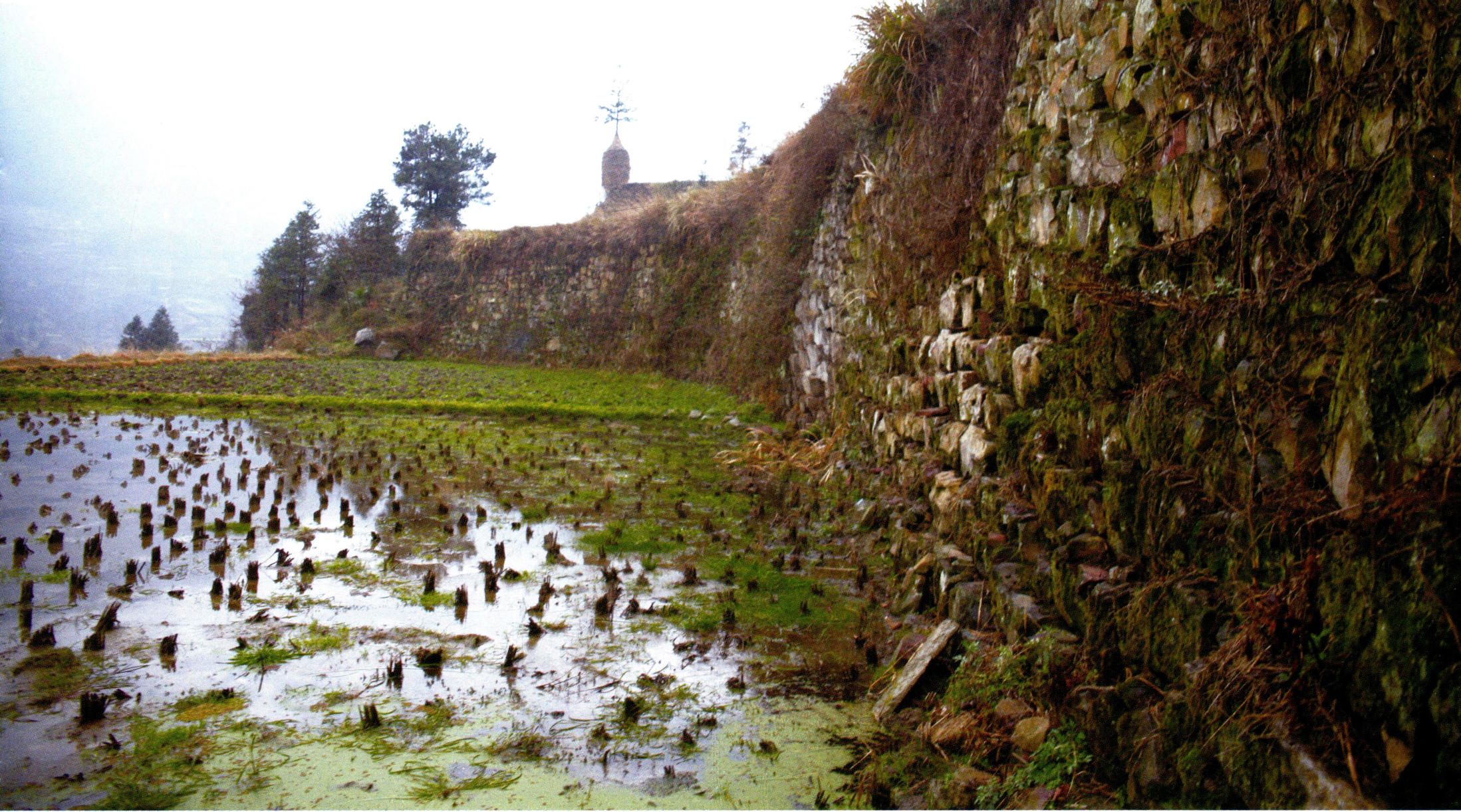 梯田群所在的山体坡度较大,总体自然坡度在25度左右,局部可达40度以上。当遇到较大降水时,地表径流对田坎产生的冲击力具有极强的破坏性,这样的自然条件使得梯田对田坎的牢固度有很高的要求,因此新街古梯田群采用了石坎来加强田坎的防洪能力。这就形成了新街古梯田的田坎类型以石坎居多现象。