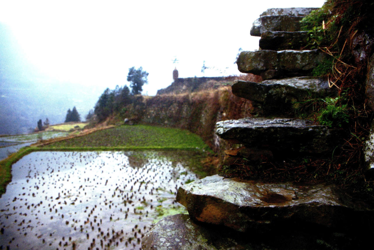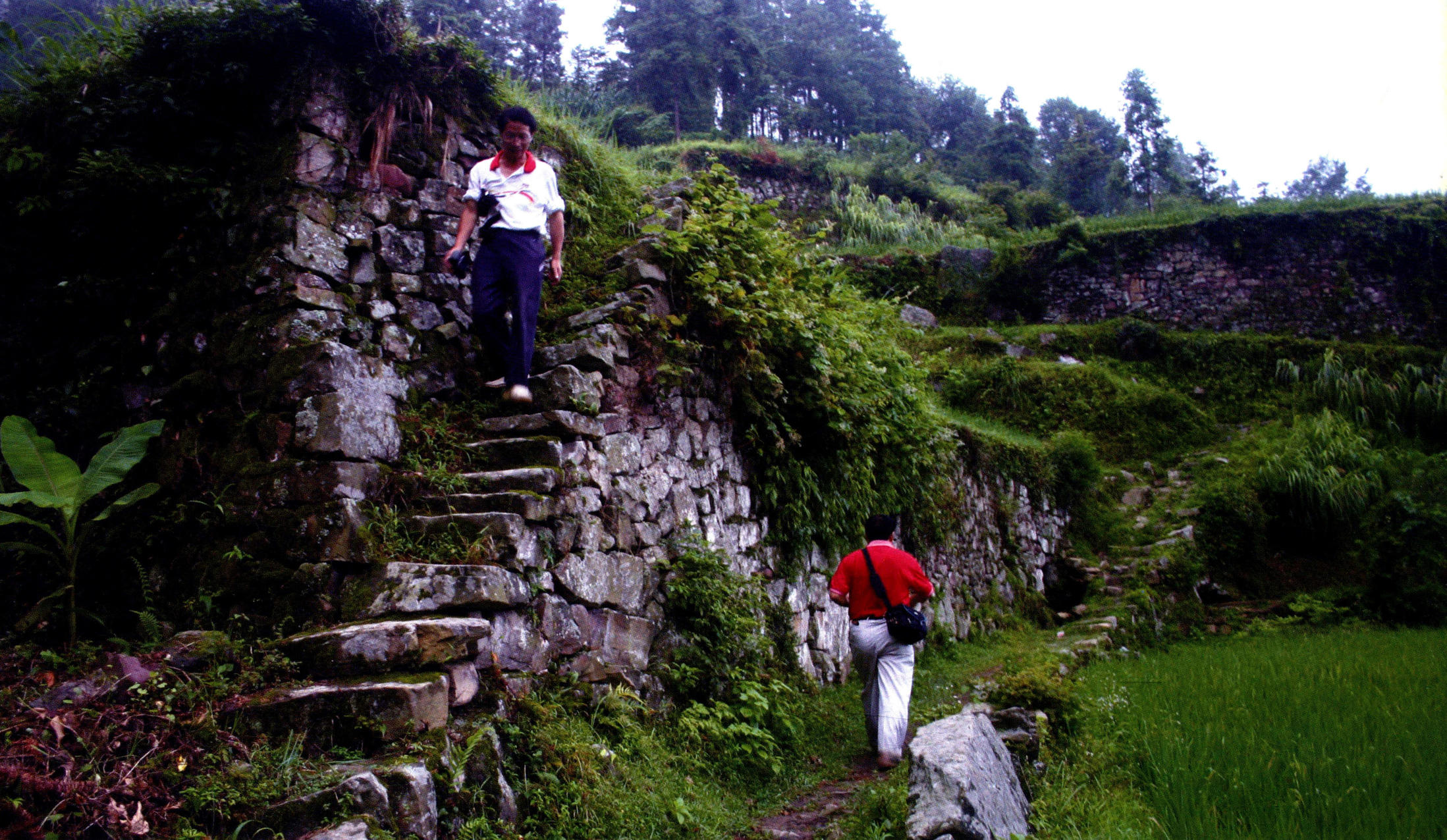 在人行步梯的设计上,非常重视与生产实际结合,因农耕及收获时经常需要牲畜与挑担通行,对步梯的宽度要求相对较高。因此在步梯的布局上,通常采用沿石坎“之”字形布设,宁愿增加长度,也要保证步梯的坡比相对较缓,以及足够的宽度。在土地紧张的区域,甚至采用悬空步梯的方式,最大限度提高空间利用率,悬空步梯成为中外梯田中绝无仅有的奇观。