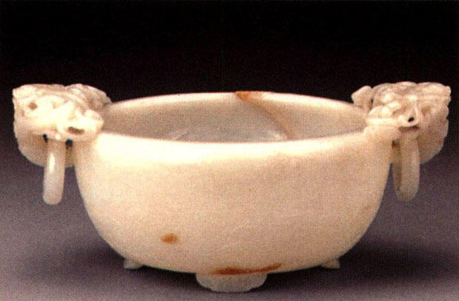 文房水具。器平底,四足,口沿处两侧各镂空雕刻螭衔灵芝云纹耳,耳下套一活环。器内底凸雕芦苇、莲荷纹。外壁浅浮雕莲荷、芦苇、飞鸟和水波纹。由莲花、莲叶组成的“青莲”谐音“清廉”,象征出淤泥而不染的君子品质;“一柄”莲花与“一品”谐音,此器纹饰寓意“一品清廉”。原为清宫旧藏。