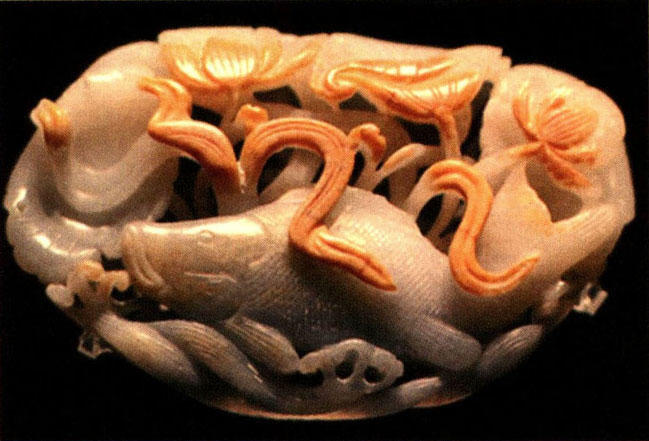 玉器的雕刻工艺主要有线刻、阳刻、双勾阴线、双勾阳纹、圆雕、浮雕、透雕、俏色巧作、带皮做、薄胎、环链、嵌金银丝、嵌宝石等。玉器雕琢主要包括选料、剥皮、设计、粗雕、细雕、修整和抛光等工序。玉雕的品种很多,主要有人物、器具、鸟兽、花卉等大件作品,也有别针、戒指、印章、饰物等小件作品。北京的故宫博物院中收藏的大型玉雕“大禹治水”,就显示了中国玉雕的高超技艺。中国的玉雕作品在世界上享有很高的声誉。