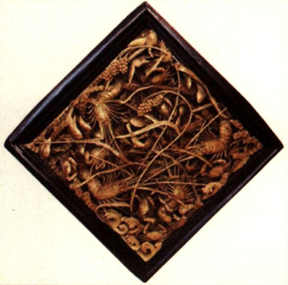 这幅菱形木雕挂屏《虾·蟹·鱼》外配退光黑漆木框,后衬朱红色漆底板作为装饰,木雕部分髹漆贴金,富丽堂皇,充分体现了典雅大度的艺术特色。画面上表现的有4只大龙虾、10只螃蟹、14条鱼、3只水鸟及芦苇、水草、螺蚌等,构图饱满,多层镂通,层层叠叠,穿插交错,综合运用了圆雕、深浅浮雕、沉雕等多种技艺,以写实的表现手法,精细雕刻,使物象生动逼真,栩栩如生。整体作品的布局丰满,层次分明,疏密相称,玲珑剔透,刀法精细,富有浓厚的生活气息和艺术感染力。