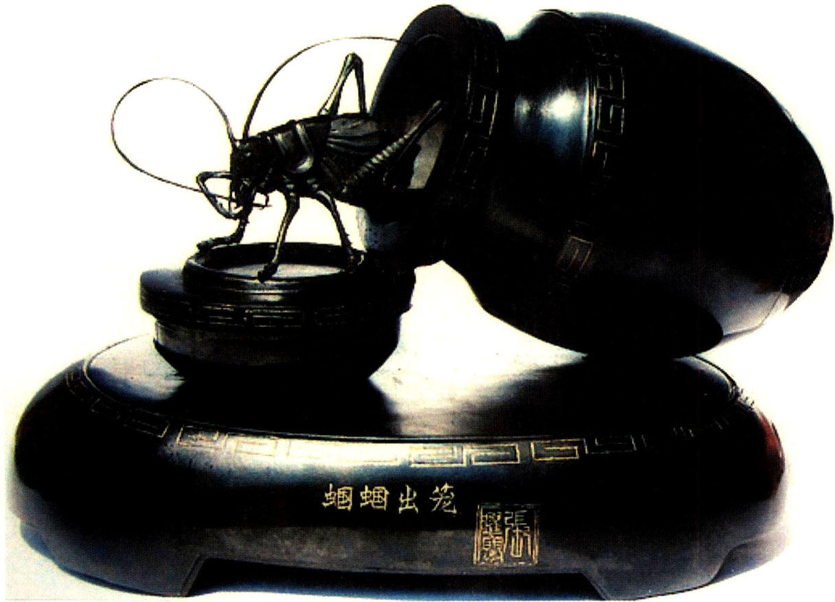 该煤精作品制作极为生动,将蝈蝈刚从笼中挣脱的瞬间雕刻得淋漓尽致,两根触须更是仿佛还在摆动,堪称煤精雕刻中的精品之作。