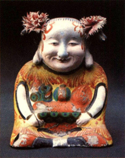 无锡惠山是古今著名的民间泥玩具产地。传统形态的惠山泥人有两大类型:“耍货”和“手捏戏文”。“耍货”(亦称“行货”)是主销儿童或平民百姓的粗货,多模印成型,装饰质朴简率。“大阿福”的定式为盘坐、怀抱麒麟,常配对成双,兼涵“驱邪镇妖”和“麒麟送子”之吉意。