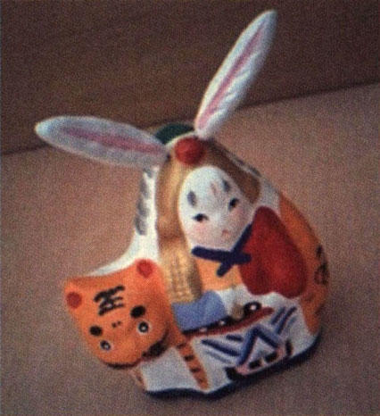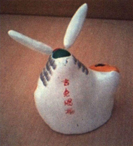 这只兔儿爷由泥捏制而成,兔面人身,整只兔儿爷最显眼的部分应该算是那两只长长的耳朵了,兔儿爷双手作揖抱于腰间,让人看着十分的欢喜。背后用毛笔写了“吉兔赐福”四个字。这是一只坐在老虎背上的兔儿爷,虎为百兽之王,是统帅,寓意事业兴盛,人脉广博。