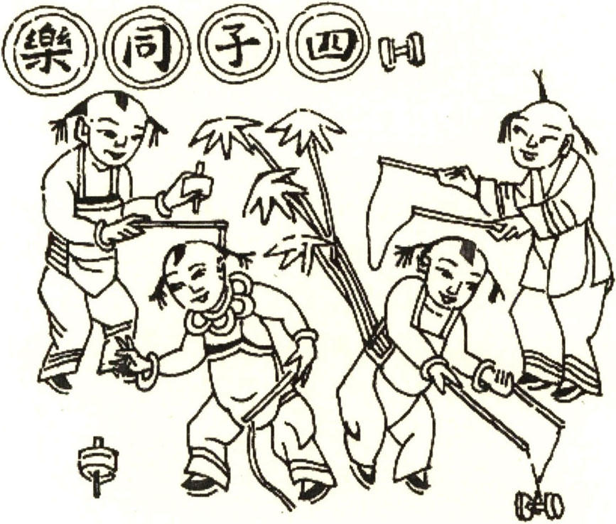 四子同乐打陀螺抖空竹(清代木版灯笼画)
