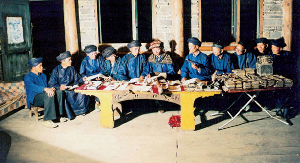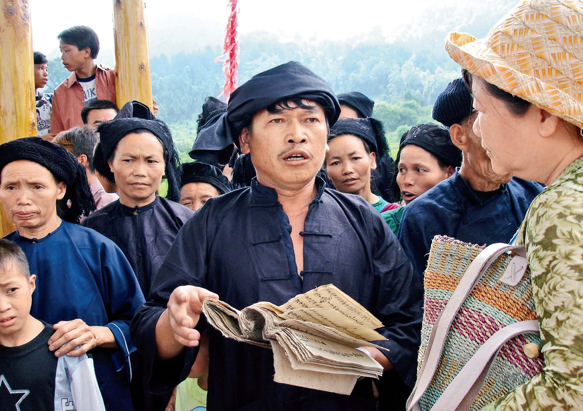 “学山学田”在水族地区形成一种普遍的激励机制,除了保障水书先生基本生活,使他们能安心传授水书外,还有两个重要的作用:其一是“学山”生长的竹子,可用来造纸,通过自己造纸来满足水书传承的用纸需要;其二是利用“学山”上的松脂制成墨锭来满足水书传承的用墨所需。可见,“学山学田”在水书传承上意义深远。难怪,当我们到韦先生家了解水书时,他老人家不是拿来而是提来几袋的水书,将两张晒谷子的大竹席铺得满满的。我们知道,在以阶级斗争为纲的年代,水书历经种种劫难。21世纪初,在党和政府抢救保护水书政策的感化下,韦先生也曾多次向政府捐赠水书,没想到现在他还保存有如此多的精品水书,我们不由得肃然起敬。当亲手摩挲着一卷卷泛黄的水书时,仿佛在历史时空的隧道里与充满智慧的水族先人进行对话。韦老先生深情地说:“当摊开水书阅读的时候,先人耳提面命的身影仿佛在灯光里不停地晃动……”