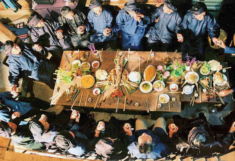 傍晚时分,余兴未尽的人们返回寨中,亲朋好友相聚在火塘边享用丰盛的端节晚宴——这时才可以开荤,鸡鸭鱼肉和水族特制的佳酿九阡酒全都端上来,家家户户不断传出“秀!秀!秀!”的欢呼声。晚宴之后,男女老幼欢聚一堂,敲响铜鼓,吹起芦笙,手拉手联袂而舞,水家村寨的端节之夜沉浸在祥和的气氛中。