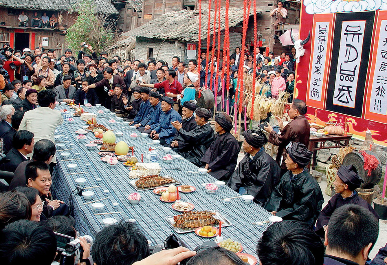 设祭之后,全寨老幼欢聚在一起敲击铜鼓、皮鼓,欢歌起舞,而后相互邀约。挨家挨户喝“团圆交杯酒”,互祝安康吉祥,共祈来年万事如意。