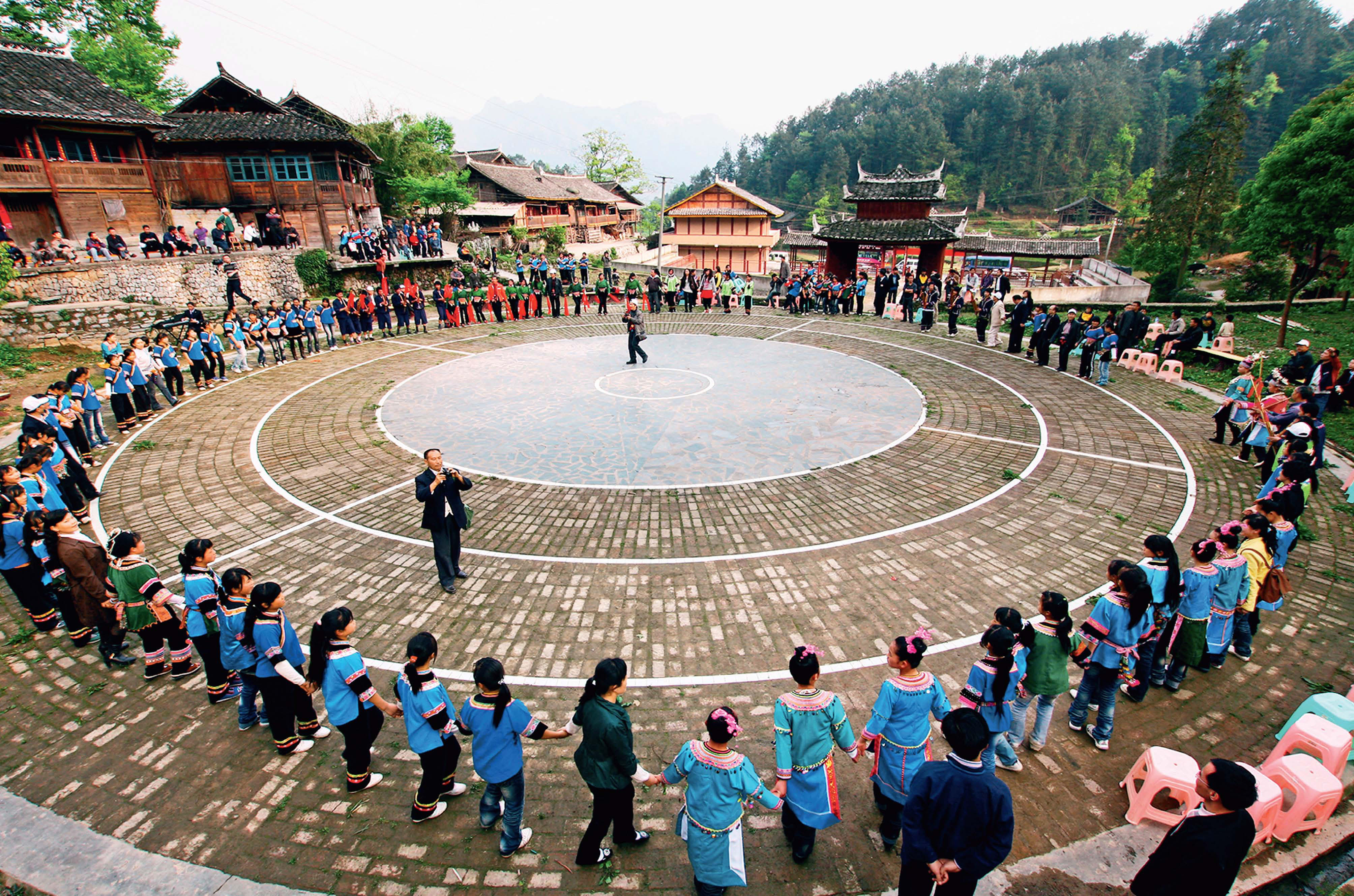 到了第三年年底,分居各地的各支族人用马驮着糯米、高粱、小米、黄豆、南瓜等,回到三洞团聚,看望老祖公拱登。三年不见面了,而今全都欢聚一堂,大家高兴地敲响铜鼓和皮鼓,手拉着手围成圆圈欢歌起舞。同时又制作鲜美的“鱼包韭菜”,连同糯米饭、米酒等供品摆放齐整地祭奠远祖。而后大家唱起敬酒歌,按祖先传下来的礼仪,大家全部围成一圈站立起来,高举酒盅,喝“团圆交杯酒”——从左至右,我端杯敬给你喝,你端杯敬给他喝,依次转上一圈,表示你中有我,我中有你,大家同心同德,心往一处想,劲往一处使,永远团结在一起。每干一杯,众人齐声高呼:“秀!秀!秀!”(秀,水语音译,干杯的意思)喊声整齐洪亮,喊得周围的山山水水全都一起来回应。