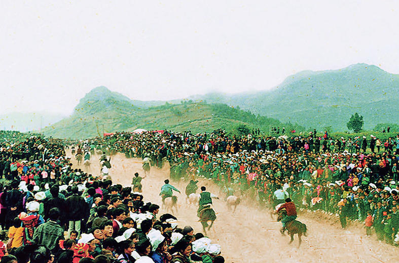 午饭后,全寨老幼和远道而来的亲朋好友、各族民众一起拥向端坡。寨老在端坡举行完祭祖祭坡仪式之后,首先骑着马沿坡道遛上一圈为赛马开道,祝愿全族人民新的一年心想事成、马到成功。随着寨老的一声令下,只见数十名骑手跨上骏马争先恐后地向坡顶冲去。端坡赛马时骑手们骑的都是未放鞍鞯的光背马,往往是几十个骑手难分先后,几十匹马相互碰撞。端坡上,马蹄声、呐喊声、喝彩声、欢呼声响彻云霄,端坡成了欢乐的海洋。