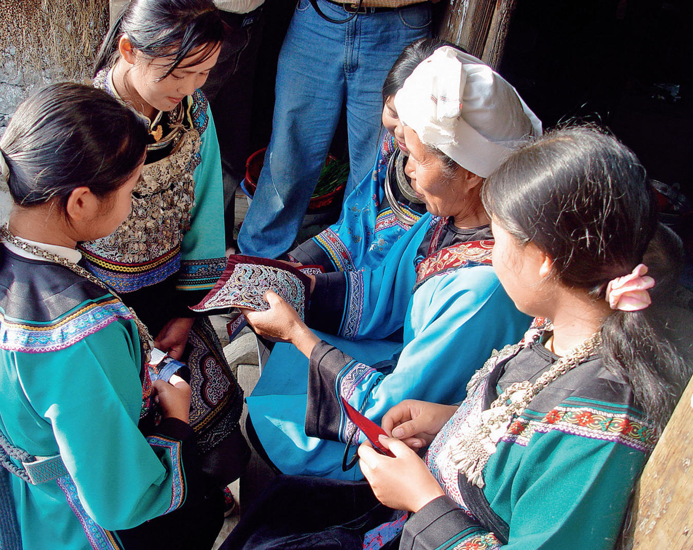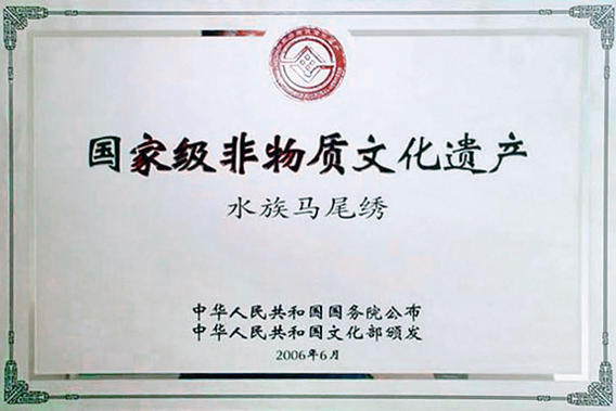 爱美的水族妇女用马尾绣来美化自己的生活,她们用马尾绣装点水族女性和小孩的服饰,装点水族男子的刀鞘护套和荷包等。大多数水族妇女都会制作马尾绣,有女儿的母亲会利用闲暇尽心尽力地培训女儿的刺绣技艺。水族女孩一般6~7岁就开始向长辈学习马尾绣技艺,到了10多岁时,刺绣技艺已相当娴熟。部分刺绣高手还会制作一些实用的马尾绣手工艺品,拿到集市上去卖,以此增加家庭收入。一张做工精细的马尾绣背扇,在20世纪80年代可以卖到400多元钱。一般来说,水族家庭中女主人的马尾绣技艺精湛就表明她很贤惠。随着水族人民生活水平的不断提高,比较富裕的家庭的女儿出嫁时,除了新娘要穿马尾绣盛装外,还要准备一些马尾绣饰品作为陪嫁的嫁妆。水族在庆祝本民族传统节日时,水族女子都要穿着平时精心准备的马尾绣盛装,这时的她们成为节庆活动中一道亮丽的风景。谁穿戴的马尾绣最漂亮、最有特色,那么她的刺绣技艺就最为精湛,大家就会羡慕和敬佩她。此时也是水族妇女们学习交流刺绣经验,探讨刺绣技艺的绝好机会,纯朴的马尾绣高手一般都会毫无保留地向求教的人传授技艺。