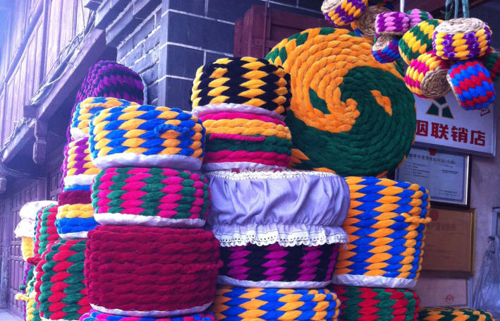 毛制品,包括纺织品和擀制品。纺织品有“平板”和“人”字形两种纺织方法。“平板”即用经、纬线交织而成。双层平板叠织即成“人”字形。织成的布料可长可短,依需要而定。宽则因受织布机限制,一般为8寸左右。布料织成后,可染成青、蓝、绿等色,也可保留本色即白色,做长衫、头帕、腰带、挎包、褡裢等,具有耐用、温暖、美观等特性。擀制品有垫毡、披毡、背毡、毡帽、毡袜等。垫毡,状为长方形,根据需要,擀制大小。旧时,因白族地区不产棉花,白族大都用软毡做被子使用。垫毡具有防潮、保温性能,故使用垫毡,不易得关节炎。披毡,有男式和女式两种,形状略像梯形,上窄下宽,均用白色羊毛制成。男式上部褶折(表层黑色),毡口穿一条毛制绳索披时系结。毡腰制有一道与毡尾缘平行的线,线上每隔4寸~5寸缀一簇长约5寸的细须,每簇五条细须,用作装饰。每毡需用六七斤羊毛即可制成,女式即小披毡,无褶折,无腰道,四五斤羊毛即可制成,工序简单。披毡在白族人民的生产生活中具有多种作用,白天可作御寒、避雨和垫背,夜间可替垫毡做寝具。访亲友、找对象,可作装饰。因此,旧时成年人必备一毡。背毡,即背具,作背小孩之用,形为正方形,每毡用三四斤羊毛做原料。毡帽,即圆平顶帽,为圆筒状,外翻叠折为两层,夹层可藏钱币、烟斗、烟袋等物,深约五寸,状如钢盔,每顶用一斤左右羊毛擀制。每帽可戴几代人,表层积污垢,酷似穿山甲外壳,用之舀水,可防中毒;放入锅中煮,水可做药用。毡袜,形如无底桶,从膝至踝,穿时与鞋口相接,构成靴子,秋冬之际凉山一带白族穿之做活。擀毡的同时,又从事皮革加工,即用旧式制革方法加工畜皮制成软硬不同的成品,皮质坚硬者做鞋底,柔软者做皮衣、皮带、平袄、鞋帮。毕节小河一带的谢、龙氏至今较完整地保存着当时的制革皮灶。至明清之际,发展成为地方特产,做朝贡之物。1949年后,白族人民还普遍使用。近年,因大量引进细毛羊,土绵羊日渐减少,民间的毛制品也随之减少,白族地区的羊毛主要出售给国家作毛纺加工原料。白族民间的纺织品主要由妇女加工,毡匠则由男性充当,大多不脱离生产,仅在农闲时进行。少数毡匠具有专业性质,一年四季从事擀毡。过去,出名的毡匠是“阿武”,即白族人。民间谚语说:“擀毡的是阿武,披毡的是彝家。”