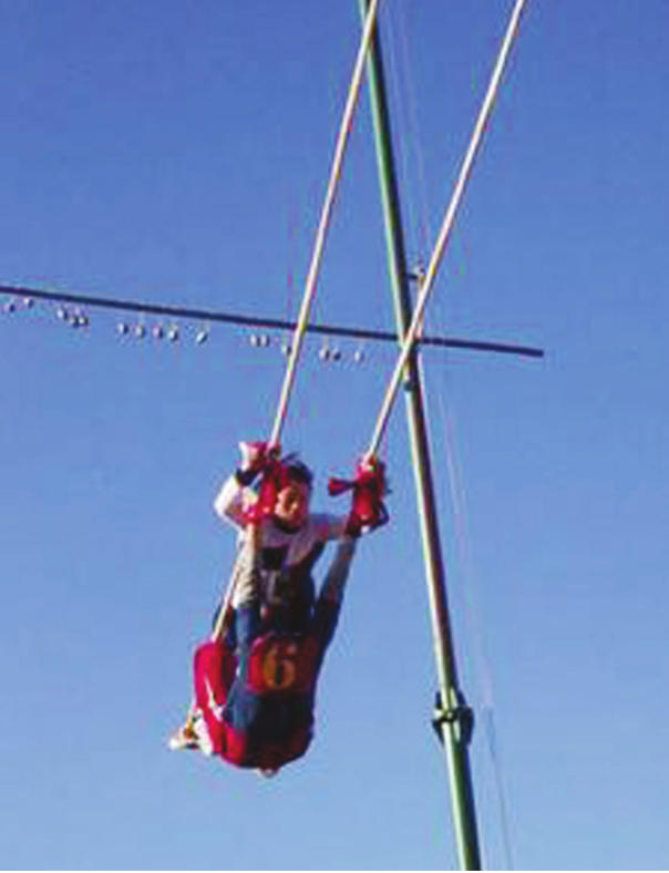 在平地上竖一木桩,顶端作轴,将一木棒逢中钻孔,套在木桩轴上,横木棒两端各坐一人或二人,用脚蹬地作旋转兼上下运动。一般在节日或冬季开展活动。