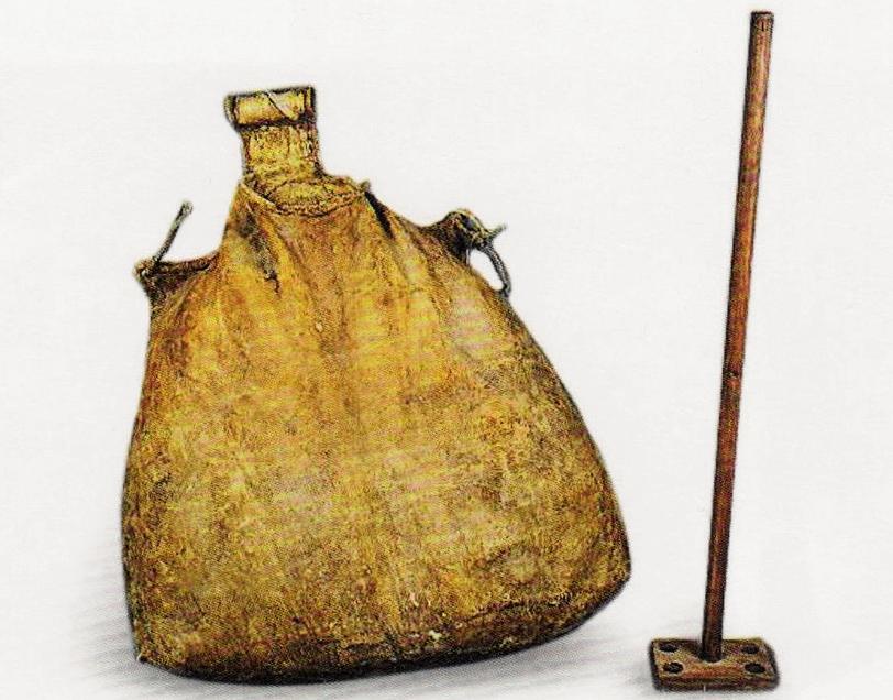 (注: 马奶酒酿制的皮囊和捣杵(内蒙古博物馆藏))