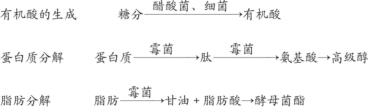接下来的发酵过程实质是由酵母菌、细菌及根霉主导,将糖、氨基酸等成分转化为乙醇为主的一元醇、多元醇和芳香醇的过程。酵母菌通过酒化酶将葡萄糖等糖分变成了酒精和二氧化碳。酒化反应中没有氧分子参与,故是个无氧的发酵过程。