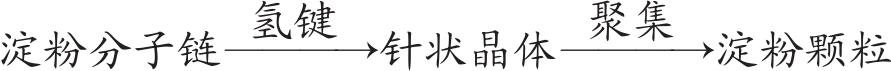 用现代的科学知识来看,谷物酿酒的糖化、酒化过程远比上述的几个方程式要复杂得多。谷物中包含以淀粉为主体的碳水化合物,还有含氮物、脂肪及果胶等,这些成分在谷物用水浸泡和加热中就会发生一系列化学变化。例如谷物中的淀粉颗粒,它实际上是与纤维素、半纤维素、蛋白质、脂肪、无机盐等成分交织在一起。即使是淀粉颗粒本身,也因具有一层外膜而能抵抗外力的作用。淀粉颗粒则是由许多呈针状的小晶体聚集而成,淀粉分子之间是通过氢键联结成束,即如下式: