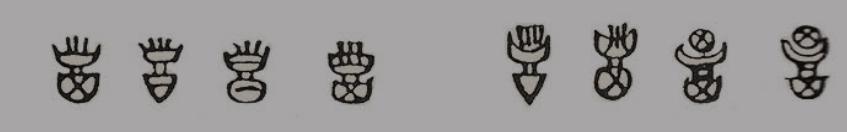 甲骨文、金文为后人研究商周文化提供了可靠的资料。在已发现的甲骨文或金文中,“酒”可能是一个较常使用的字。它的象形文字如下图所示,有多种形式。从这些象形文字的变化来看,当时的酒字还没有最后定形。金文中不少酒字也都与酋字相近。进一步的比较还可以看出,酒字与酋字又有着密切的联系,可推测“酋”最初的含义是造酒。《说文解字》对“酋”的解释是:“酋,绎酒也。从酉,水半见于上。礼有大酋,掌酒官也。”《礼记·月令》称监督酿酒的官为“大酋”,设官管理表明在周代酒的生产和供应颇受重视。