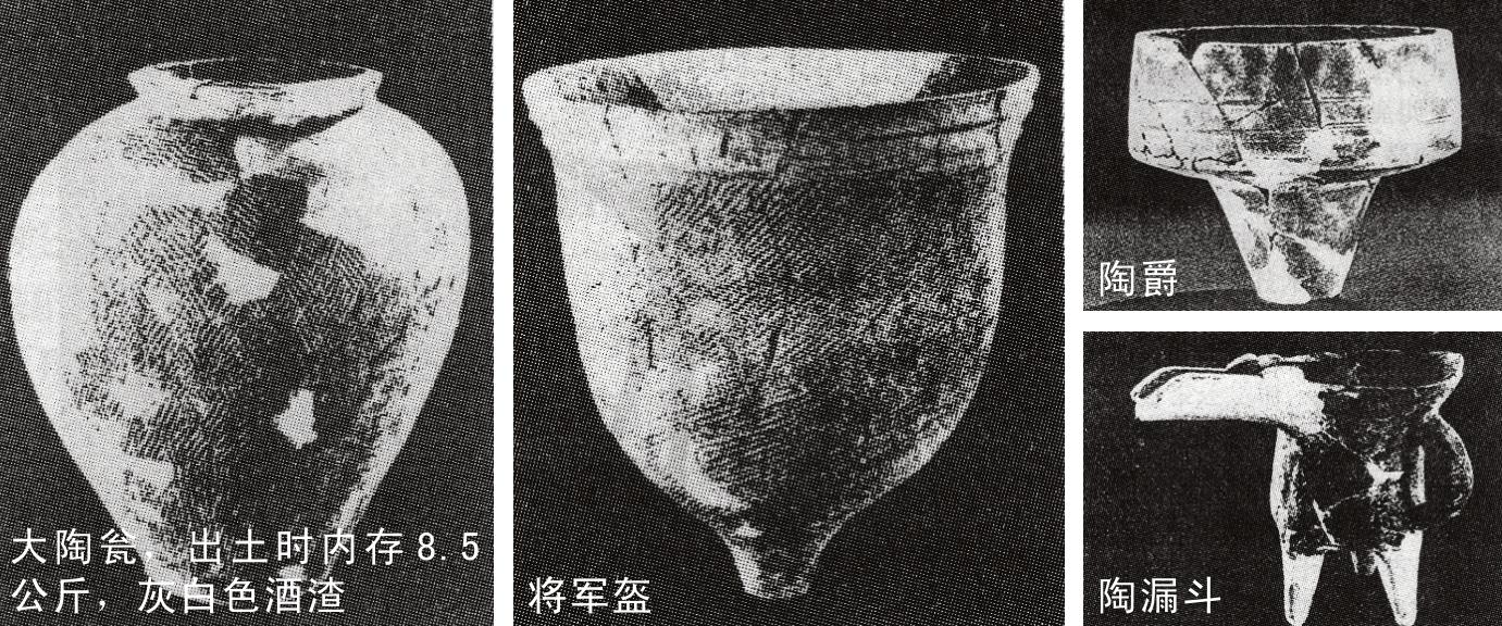 1974年在河北省藁城县台西村商代遗址,发现了商代中期的造酒作坊,出土了一批酿酒用器材及酒器。它是一座建在夯土台基上的两间没有前墙的屋子,室内面积约36平方米,作坊出土了陶瓮、大口罐、罍、尊、壶等酒器,其中一只大陶瓮内存在8.5公斤灰白色水锈状沉淀物,经中国科学院微生物研究所鉴定为发酵酒挥发后的残渣,其主要成分为曲酒中死亡的酵母残壳。这些曲酒不是浊酒,否则瓮中的残渣就不会只有8.5公斤,但这不等于当时的人已大量饮用清酒,因为那时可能还没有榨酒设备,只是舀取酒醪上面的清液进行简单过滤而得。这是我国目前发现的最早的酿酒实物资料。在发掘中还发现,另外四件罐中分别存有一定数量的桃仁、李、枣、草木樨、大麻子等五种植物种子,推测它们大概也是用于酿酒的原料。在1985年的继续发掘中,又发现在酿酒作坊附近有一个直径在1.2米以上,深约1.5米的谷物储存窖穴。这些谷物经鉴定为粟。台西村商代酿酒作坊的完整发现,至少给我们三点启示。一是发现的人工培养的酵母和酒渣粉末,展示了商代中期的酿酒工艺和水平。二是根据酿酒的实物资料,可以推测当时除酿制谷物酒外,还可能酿制果酒和药用露酒。三是出土的酿酒设备,表明当时已有相应的酿酒器具的配套组合。