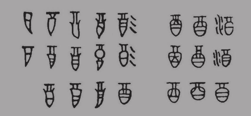 最早出现的文字大多是象形文字,汉字也不例外。甲骨文和钟鼎文属于早期的汉字,甲骨文和钟鼎文中的“酒”字几乎都是小口尖底瓮的形象,即“酒”字曾用酿酒容器来象形,由此可以推测小口尖底瓮与酿酒的关系。