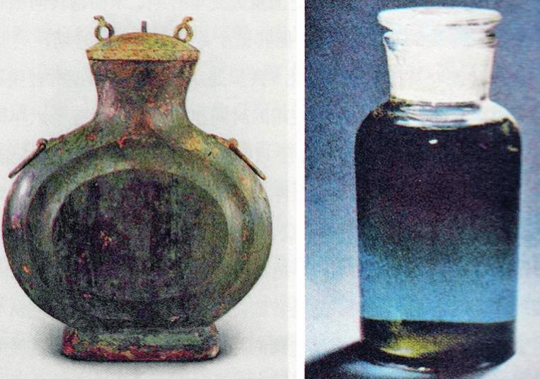 (注: 河北平山县中山王墓中出土的扁酒壶及其中液体)