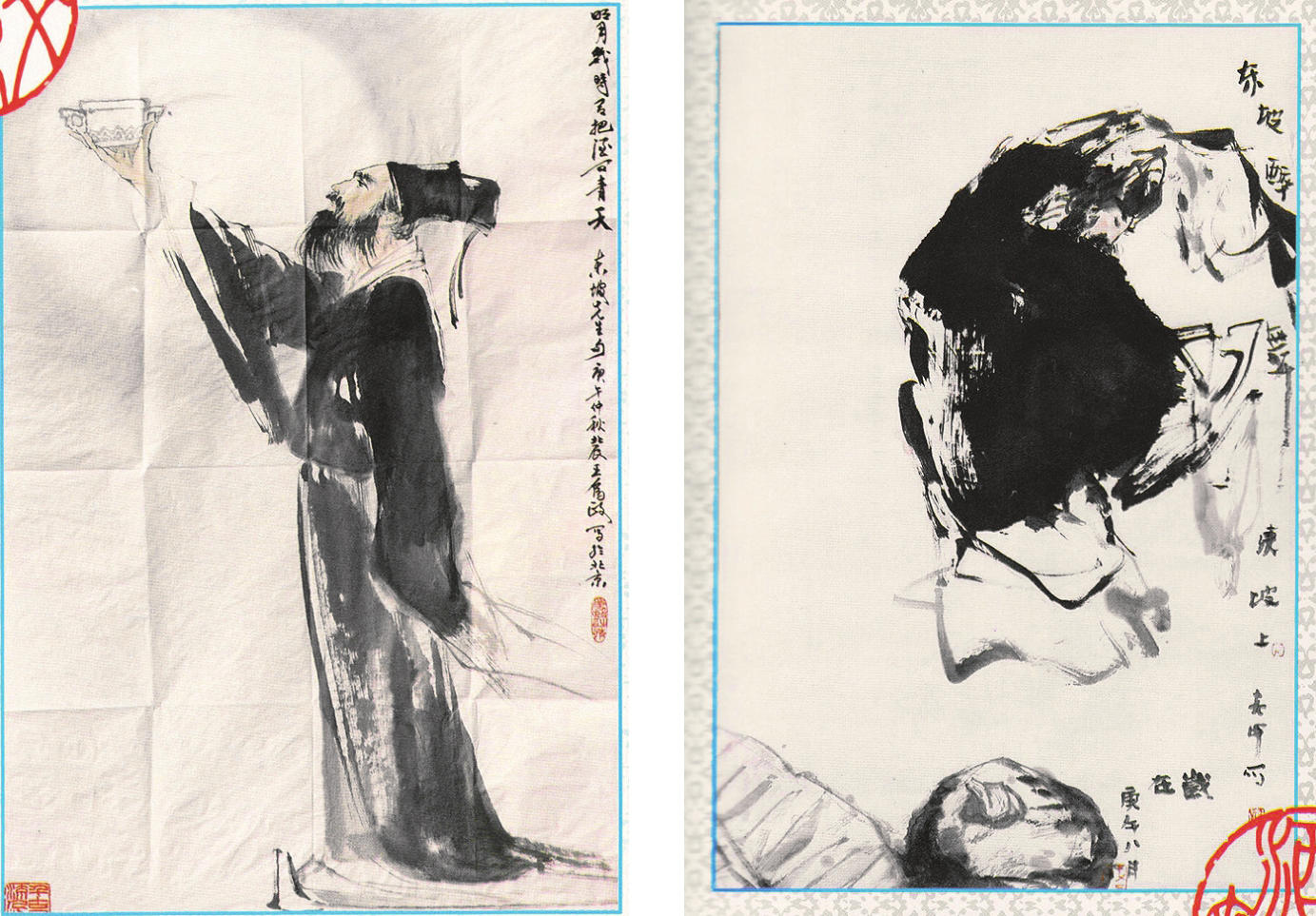 (注: 关于苏轼的两幅国画:东坡把酒问青天(左),东坡醉舞(右))