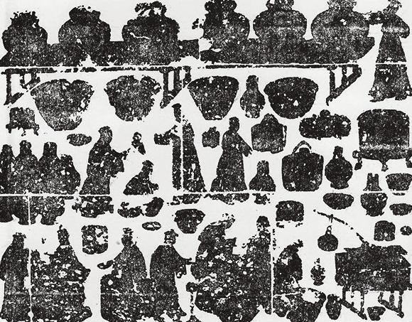 (注: 石刻画:酿酒备酒图(河南密县打虎亭1号汉墓东耳室出土,图分三栏,第一栏是盛酒的酒瓮。第二栏是将酒装入瓮。第三栏是描绘酿酒过程))
