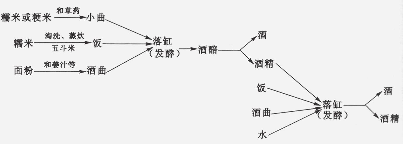 他以这简练的数百字,从制曲到酿酒都作了扼要、清晰的介绍。其要点是:①以糯与粳米杂以草药制成草曲(小曲)。②面粉和以姜汁等,制成酒曲(类似于朱肱所讲的“真一曲”)。③三斗米炊熟后,和以四两小曲、三两酒曲和少量水,装入瓮中,中间挖一“井坑”。④三日后瓮中井坑因发酵后产生醪液而满溢,表明此时发酵在激烈进行。口尝味有点苦。这时候可以投饭五升,三日后再投饭五升,九日三投,十五日完成投饭。然后再注入一斗水(必是熟冷水,酿与投饭都必放凉后再投)。再过五日,可以用酒笼漉取酒液三斗半。⑤利用漉后的酒糟,加上五升饭和三倍于饭的水及四两酒曲,再入瓮发酵,五日后,发醪液用酒笼漉取,再得酒一斗半。⑥两次共漉得酒五斗,合在一起,放置五日就可以饮用了。其酿酒操作示意图如下: