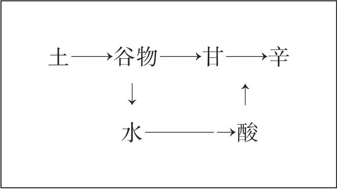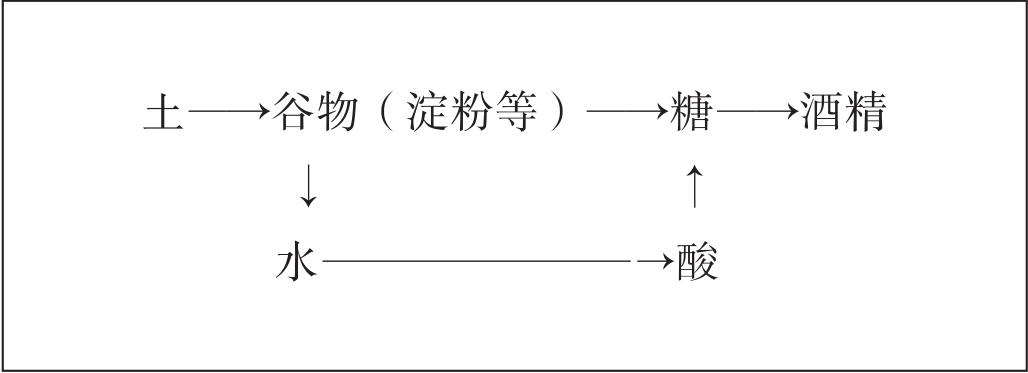朱肱不仅总结了当时酿酒过程的实践经验,同时也对酿酒过程的机理进行了探讨:“酒之名以甘辛为义。金木间隔,以土为媒,自酸之甘,自甘之辛,而酒成矣。所谓以土之甘,合水作酸,以水之酸,合土作辛,然后知投者所以作辛也。”这段文字可以理解为酒之所以是酒是由于它含有甘、辛两味。金(辛)和木(酸)没有直接联系,通过土(甘)这一媒介可以把它们联系起来,由酸(木)变甘(土),由甘(土)变辛(金),酒做成了,所以酴米要有酸浆,投醹要有甜味。土中种植出来的谷物,通过水可以做成酸浆,酸浆又可促成谷物变成辛味物质,明白这一道理,就可以做酒了。这里的土既表示土地,谷物滋长的地方,又可表示从土地里收获的谷物,所以甘代表甜味物质(即稼穑作甘),辛代表酒味物质,酸即酸浆。朱肱的上述酿酒机理的表述可用下图示意: