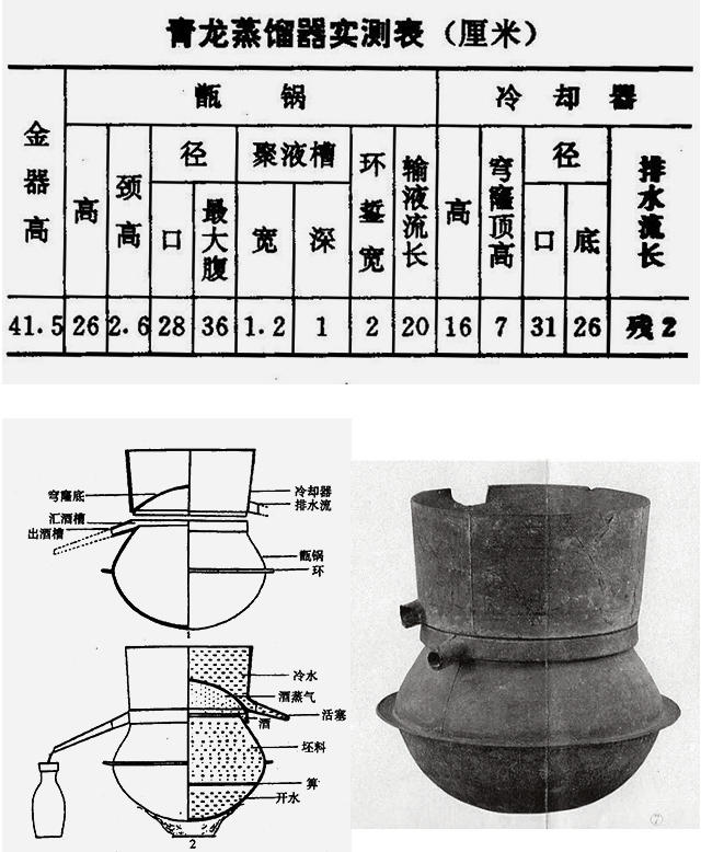1975年在河北省青龙县西山嘴村金代遗址中出土了一具青铜蒸馏器。由图可见,它是由上下两个分体叠合组成。其各部分的尺寸如附表所列。根据其构造,可以推测其使用时的操作方法可能有两种:一是直接蒸煮,二是加箅蒸烧,都可以收集到蒸馏液。