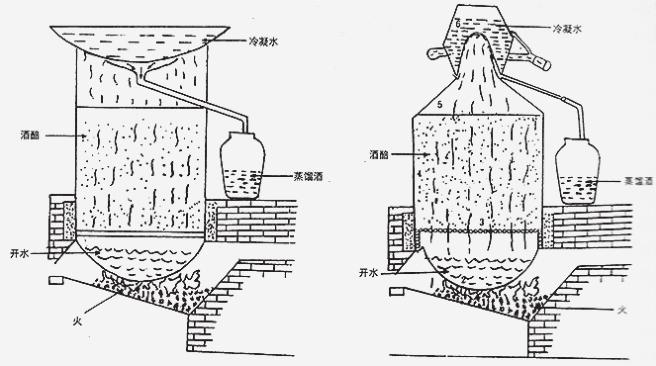 (注: 天锅式蒸酒器(左)、壶式蒸酒器(右)示意图)