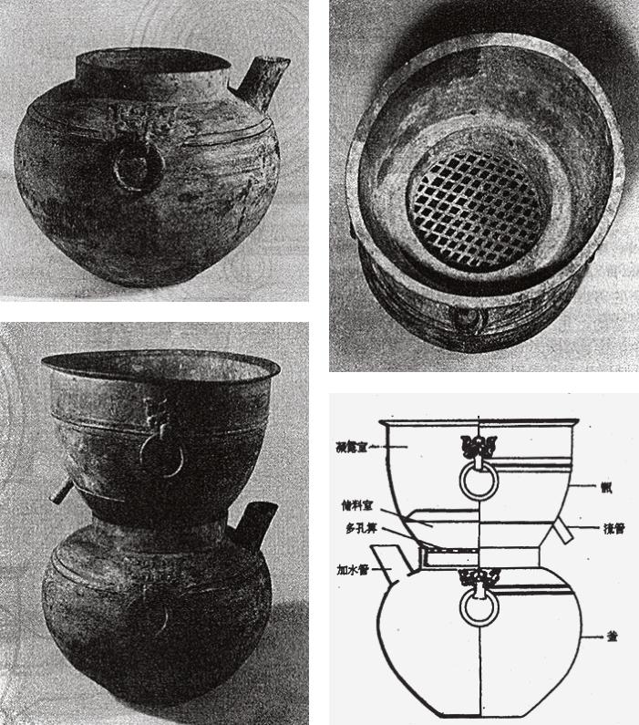 上海博物馆所收藏,东汉时期的以青铜铸造的蒸馏器是国内目前已知的最早的蒸馏器实物,其基本形式与汉代的釜甑相似,但有一些特殊部件。其形制如图所示。
