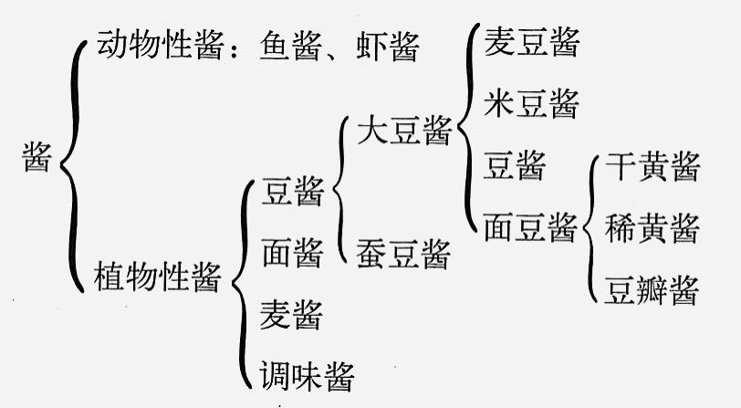 各种食材都可以加工成酱,所以酱具有广泛的内涵。依原料来分,古代的酱可分为四大类:豆酱、面酱、麦酱、菜蔬水果酱。前三种经发酵工艺,后一种直接将菜蔬或水果弄碎经一定工序(不需发酵)而制成,例如各种果酱、花生酱、番茄酱、芝麻酱、芥末酱等。