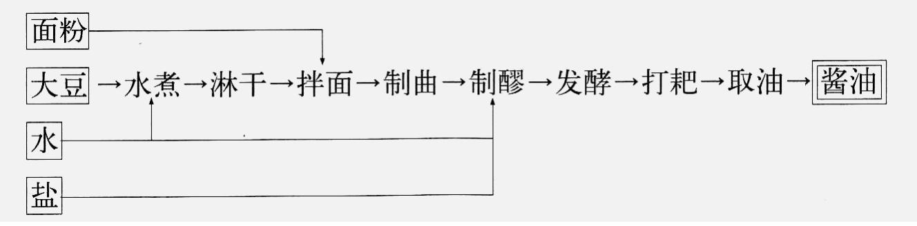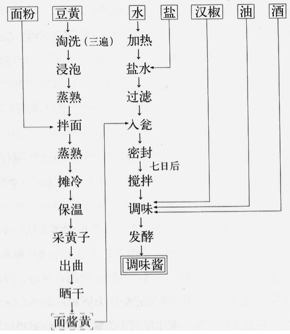 (注: 《四时纂要》中“十日酱”的生产工艺流程)