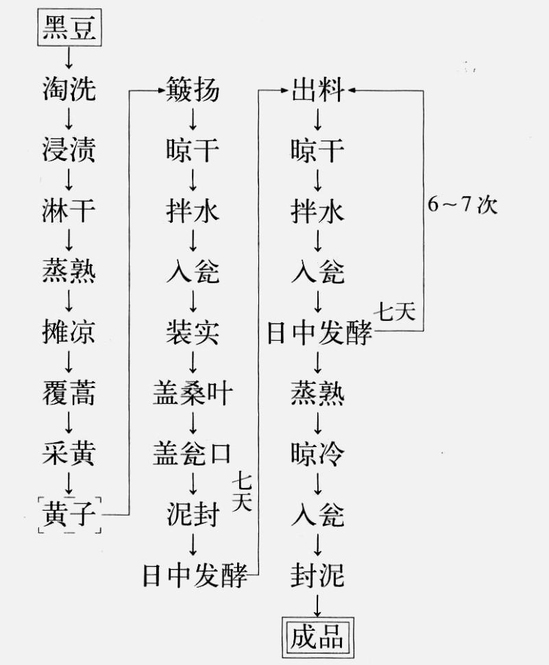 (注: 韩鄂《四时纂要》中“作豆豉”的生产工艺流程)