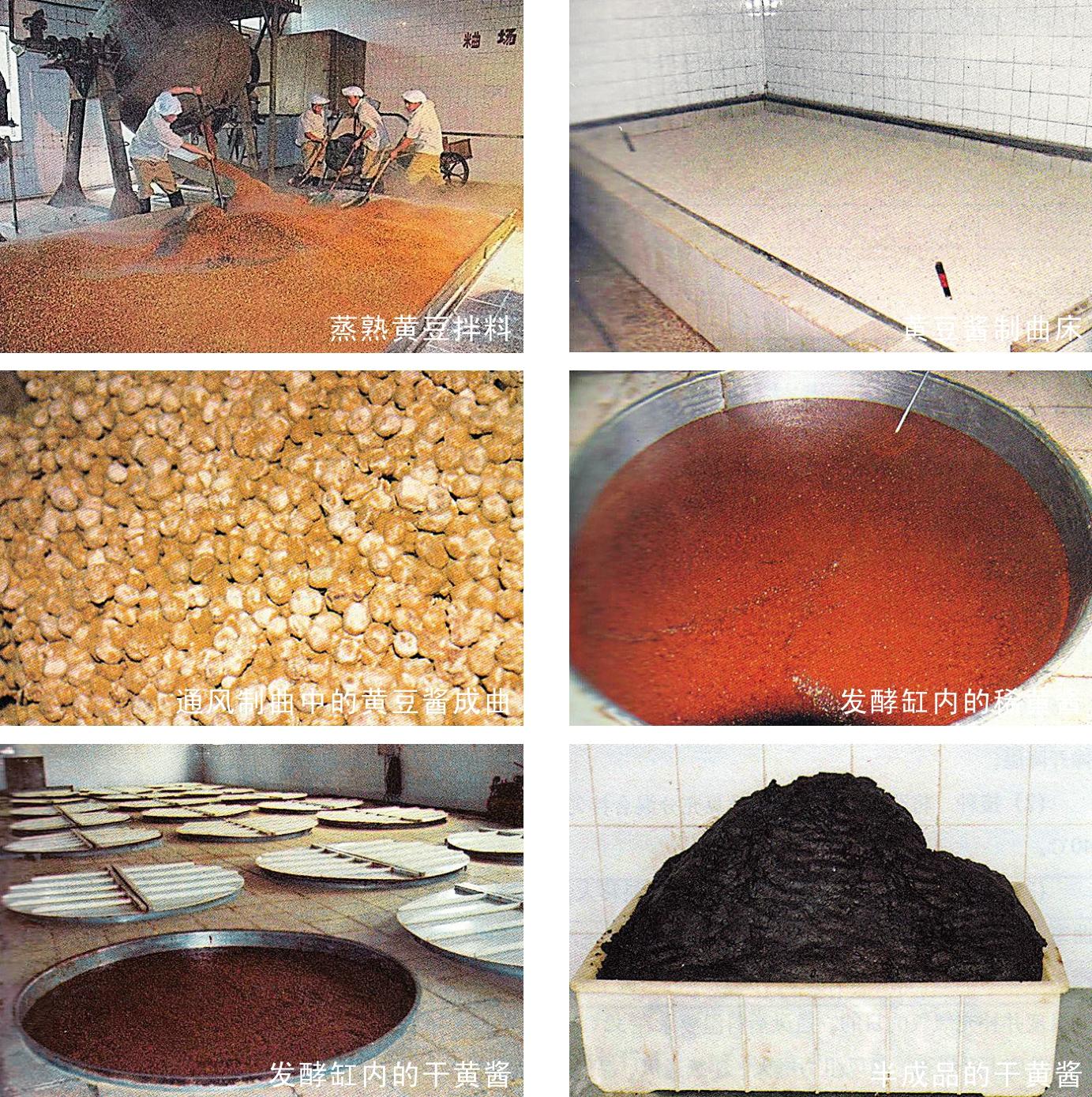 酱油制作的主要原料是大豆,其生产工艺实质上是豆酱工艺的延伸。首先是原料的精选和预加工(去除杂质),然后是原料的破碎和浸渍,浸渍中要注意水量的配比及温湿度。第三步是原料处理的核心:蒸煮。现在的蒸煮技术设备已有很大进步,有旋转式高压蒸煮罐或FM式连续蒸煮装置。蒸煮既可以使大豆蛋白达到适度的变性,又可使淀粉等碳水化合物达到糊化,糖类得以分解及灭杀了杂菌。在大豆预加工的同时,作为辅料的小麦和麦麸也同样进行预处理。小麦通过焙炒、破碎,麦麸经过蒸熟,再与大豆混合制曲。在豆面混合醅上制曲是发酵前的关键工序。挑选经过长期筛选而得的纯种种曲,这种曲必须具有强大的蛋白质水解酶系和一定量的糖化酶及特强的排他性。种曲的生产是以获得纯度高的曲霉分生孢子为目的,使用的材料以麦麸为主,在种曲室采用曲盘法生产。过去制曲都是在帘子或曲盘上开放式地操作,这一制曲过程不可避免地会混入杂菌,影响成曲的质量。现在大都改用机械化的通风制曲装置,用控制风速来调节曲池培养床上的曲料温湿度,促成米曲霉等有关霉菌的孢子和菌丝正常发育生成,最终获得理想的曲醅。