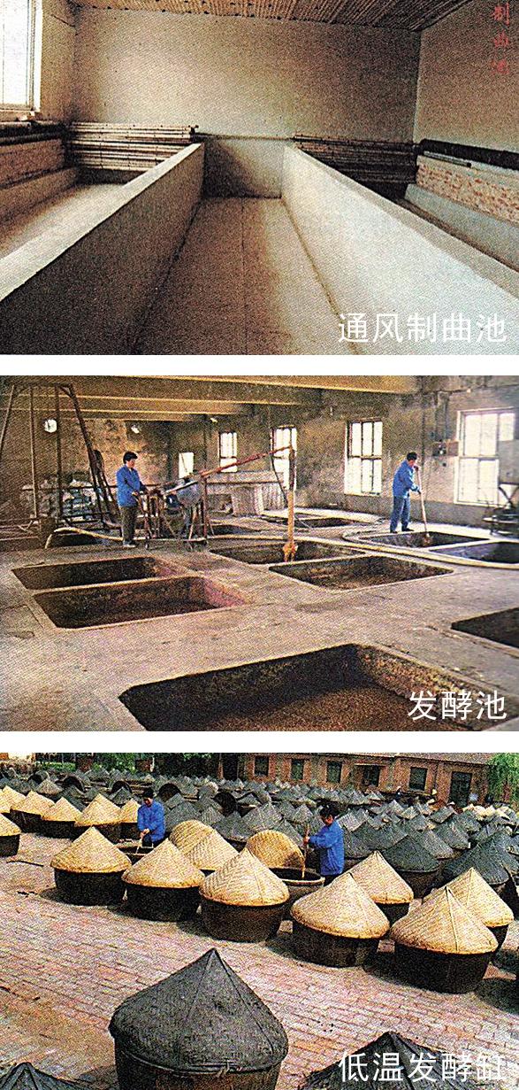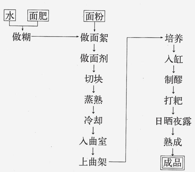 下道工序是制醪发酵。先将发面黄刷去菌毛(便于盐水进入曲内),粉碎后称重入缸,每缸入曲150公斤,加14°盐水150公斤,充分搅拌,再进行日晒夜露,每隔1~2天轻度打耙一次,中间每4天补一次盐水3公斤,共补4次。在夏季2个月即熟成。