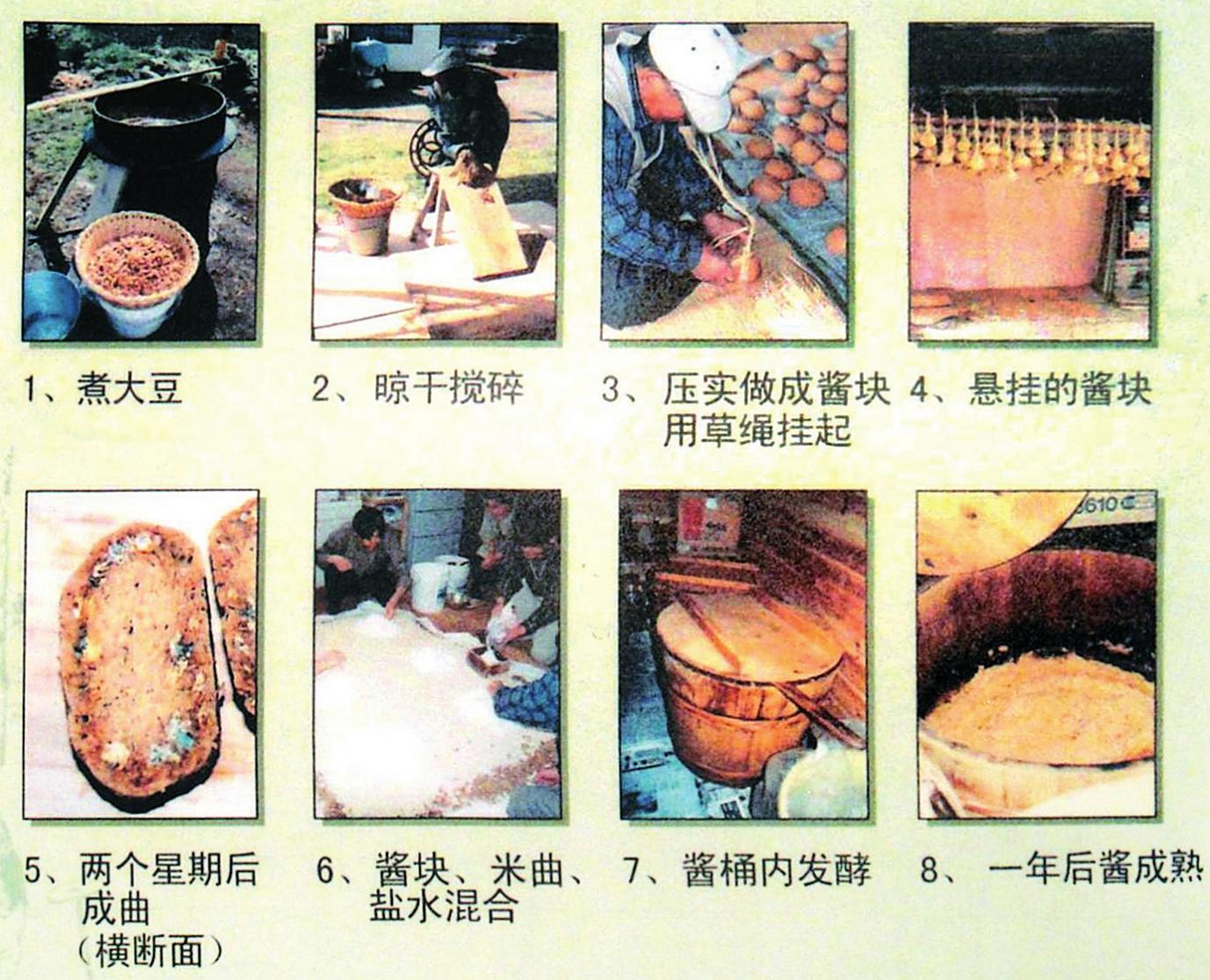 大豆浸泡约10小时,水温若高,时间可缩短,以豆粒膨胀无皱纹为度。泡涨后大豆捞出沥干,上甑蒸约2小时,圆气,蒸至半熟上下对调进行翻甑,以保证熟得均匀,再继续蒸3小时。停火出料,此时豆粒用手捏易碎为度。蒸熟的豆子出甑在竹席上摊凉至室温,再移入曲室,装入竹匾任其自然发霉。装匾要求厚薄一致,一般8厘米厚。注意门窗开闭控制好气温。自然发霉从立冬起至雨水,仅4个月,室温掌控在9℃~11.5℃,室温和品温应一致。