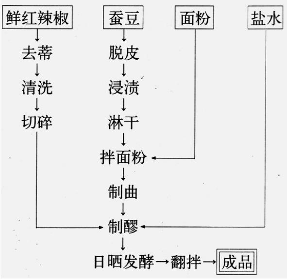 豆瓣酱以蚕豆为主要原料,故又称蚕豆酱。豆瓣酱的主要产区在四川。清代光绪时期的曾懿所著的《中馈录》中就记载了她家乡四川辣豆瓣酱的生产工艺:“以大蚕豆用水一泡即捞起,磨去壳,剥成瓣,用开水烫洗,捞起用簸箕盛之。和面少许,只要薄而均匀,稍凉即放在暗室,用稻草或芦席覆之,候七八日起黄霉后,则日晒夜露。从七月底始入盐水罐内,晒至红辣椒熟时。用红椒切碎浸渍和下,再晒露二三日后,用坛收贮。再加甜酒少许,可以经年不坏。”由此记载可知当时盛名的四川辣豆瓣酱是以生蚕豆瓣加少量面粉为原料,通过先制曲后发酵的方法生产的。当今四川郫县豆瓣酱的生产就是继承这一工艺。