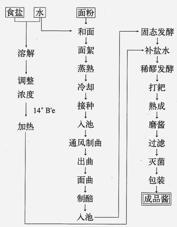 大豆→计量→去杂,漂洗→浸泡→蒸料→冷却→混合接种(加入面粉及种曲)→通风制曲→第一次翻曲→第二次翻曲→成曲→入缸→翻倒→澥稀→打耙→成熟研磨→黄酱。