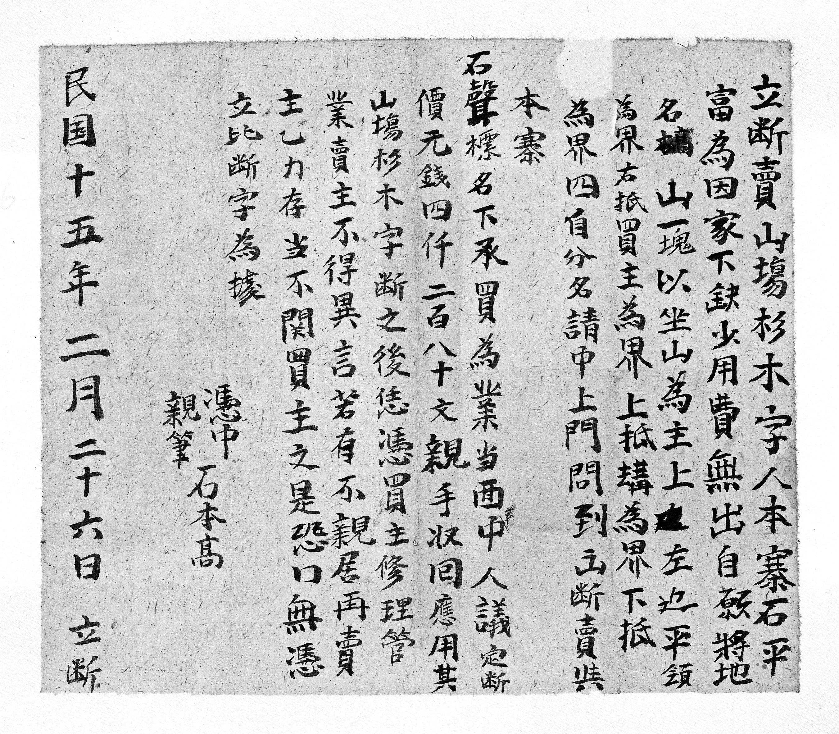 石逢濱斷賣杉山字約(民國十四年十月初四日) LP-76-16