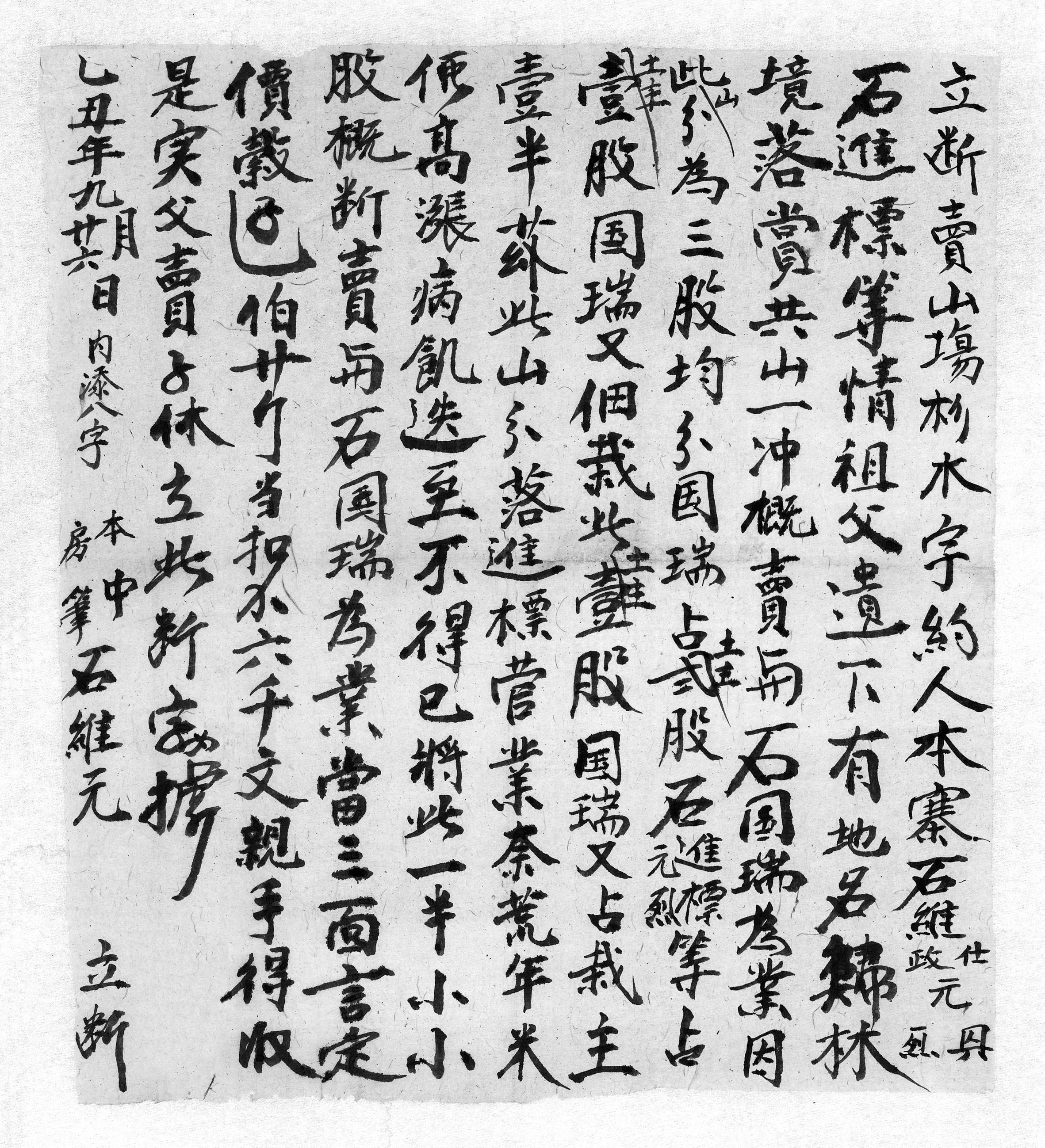 石燦然斷賣田字約(光緒十九年十二月二十七日) LP-76-1