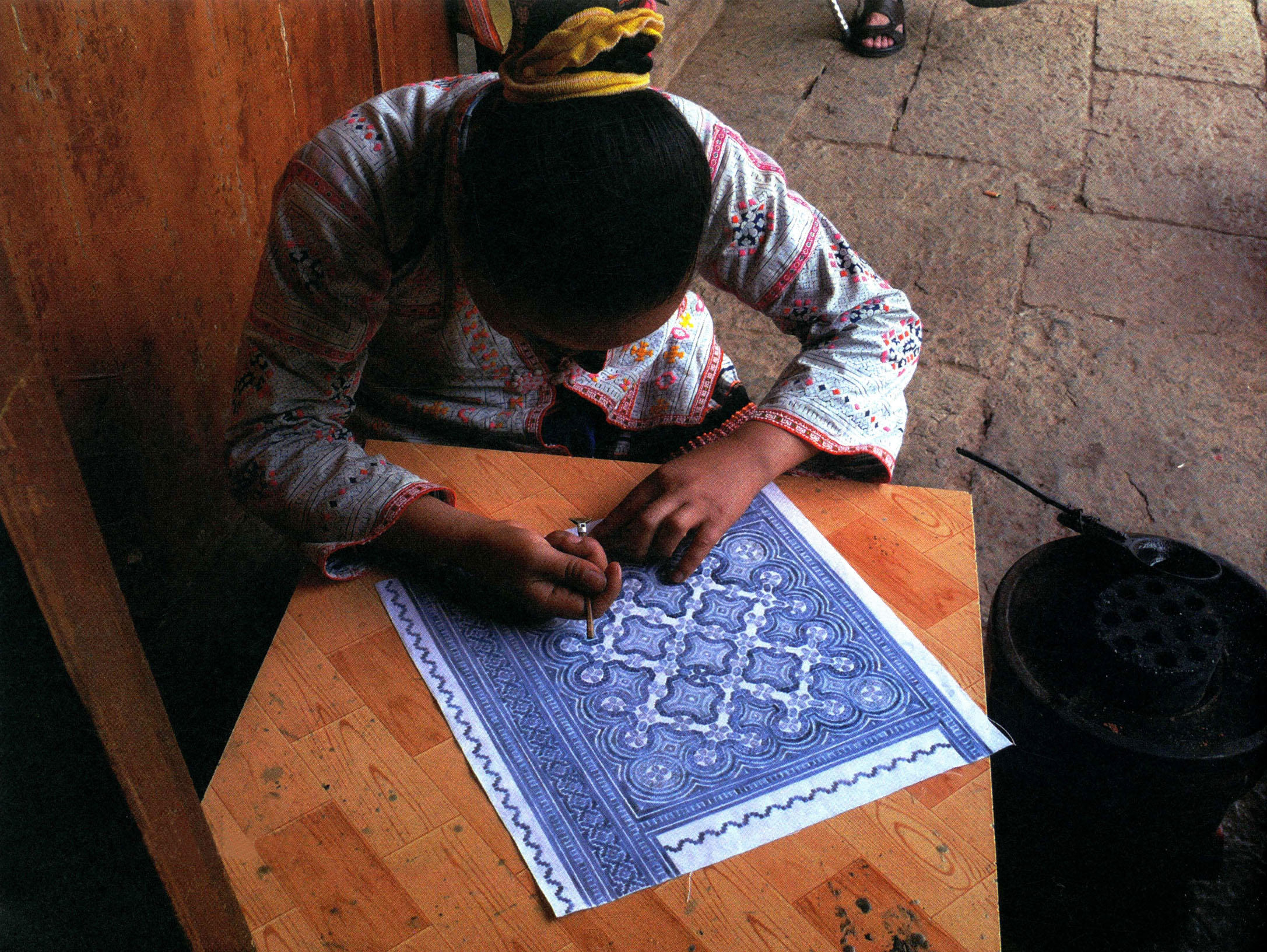 在另一边,寨老的小女儿和孙女正全神贯注地在一张白布上画蜡画。蜡碗置于火上,蜡熔化成半碗液体——这就是她们画蜡画的原料。她们先是用蜡刀在蜡碗里蘸了蘸,然后在白布上由上至下拉出一条直线来,这条直线和尺子画出的直线相差无几,太神奇了。接着,她们又拉出几条等距离的直线,然后再从左至右拉出与竖线相交的几条直线,将它们分成大小相等的格子。约翰·杰斯特龙先生惊呆了,对苏东海先生说:“也许这就是世界上最精美绝伦的文化!”